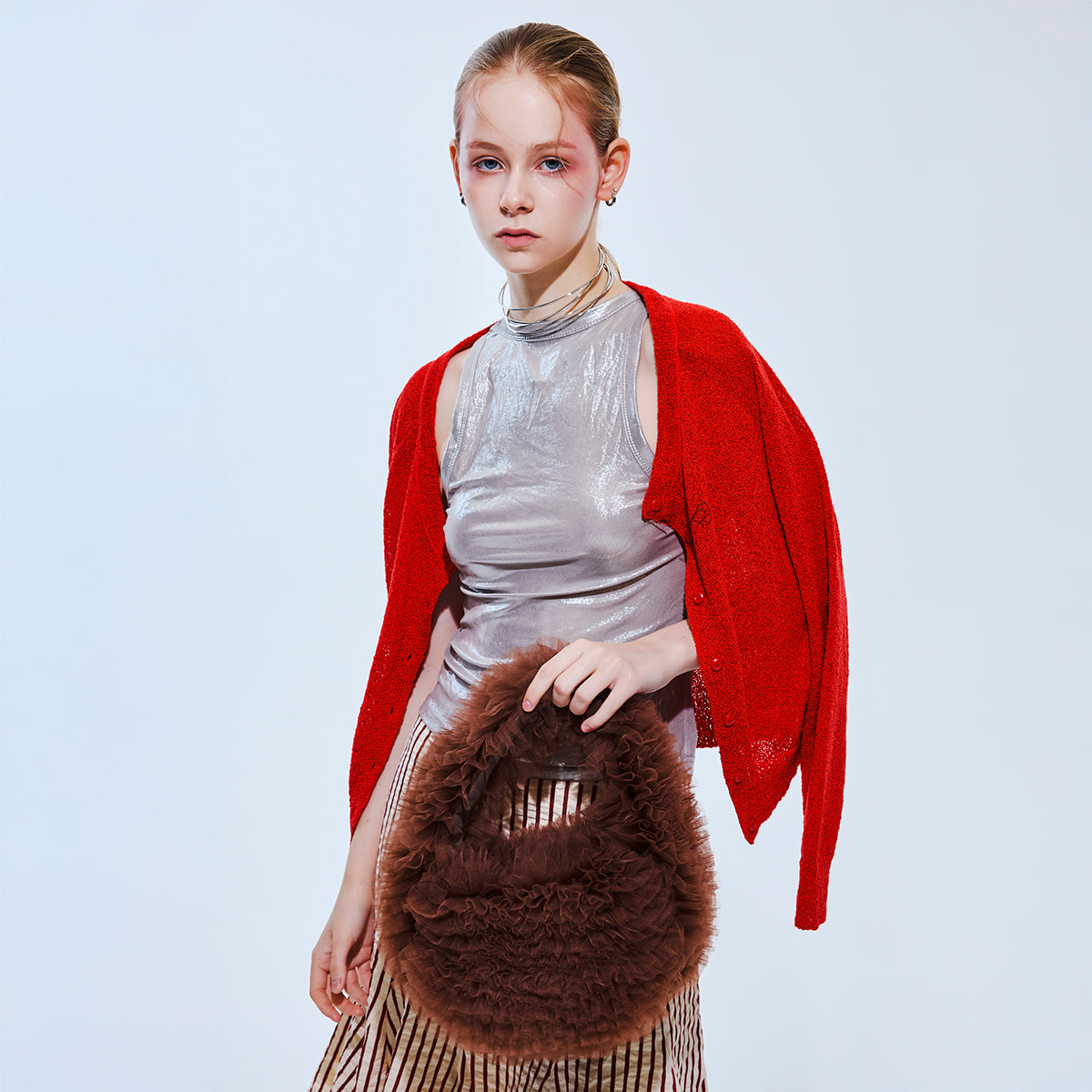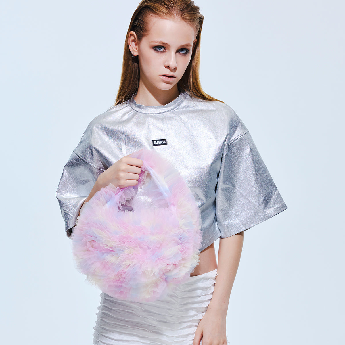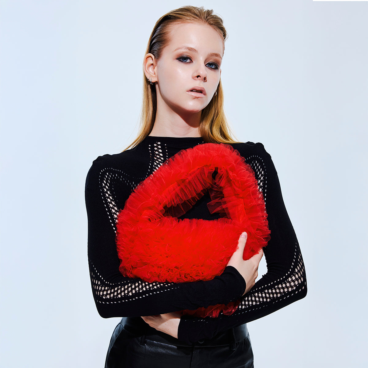 • Wrapped in architectural tiered tulle, it adds a sharp, modern dimension to any look