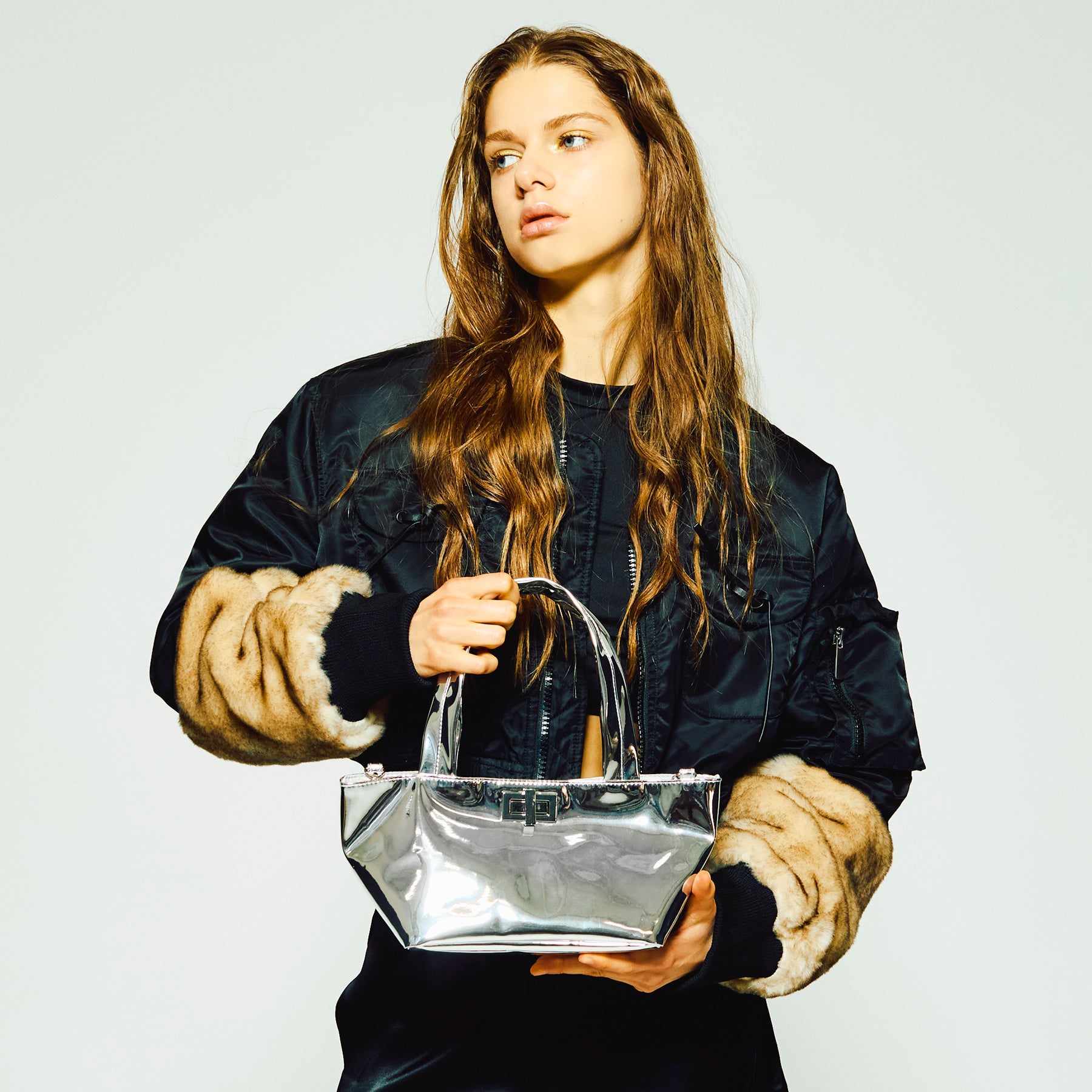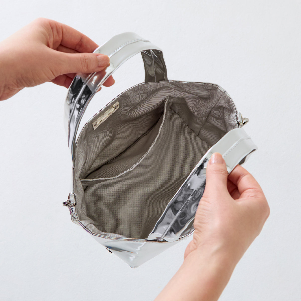 シャープで大人っぽい印象のミラートートはドレスからデニムまで幅広くマッチします。